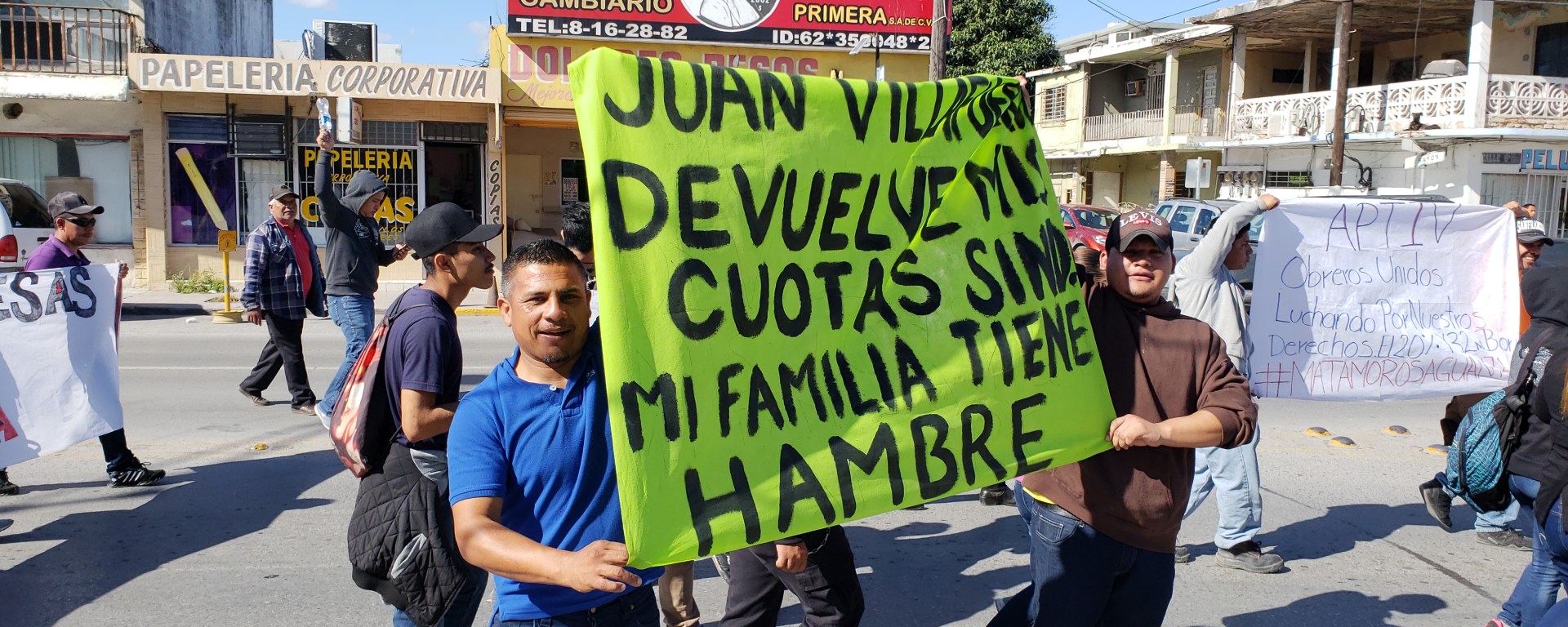 En su noveno día de marchas y paro de labores en la industria maquiladora, cientos de obreros llevaron una marcha que inició desde un centro comercial, pasó por el puente internacional hasta concluir en la plaza principal.