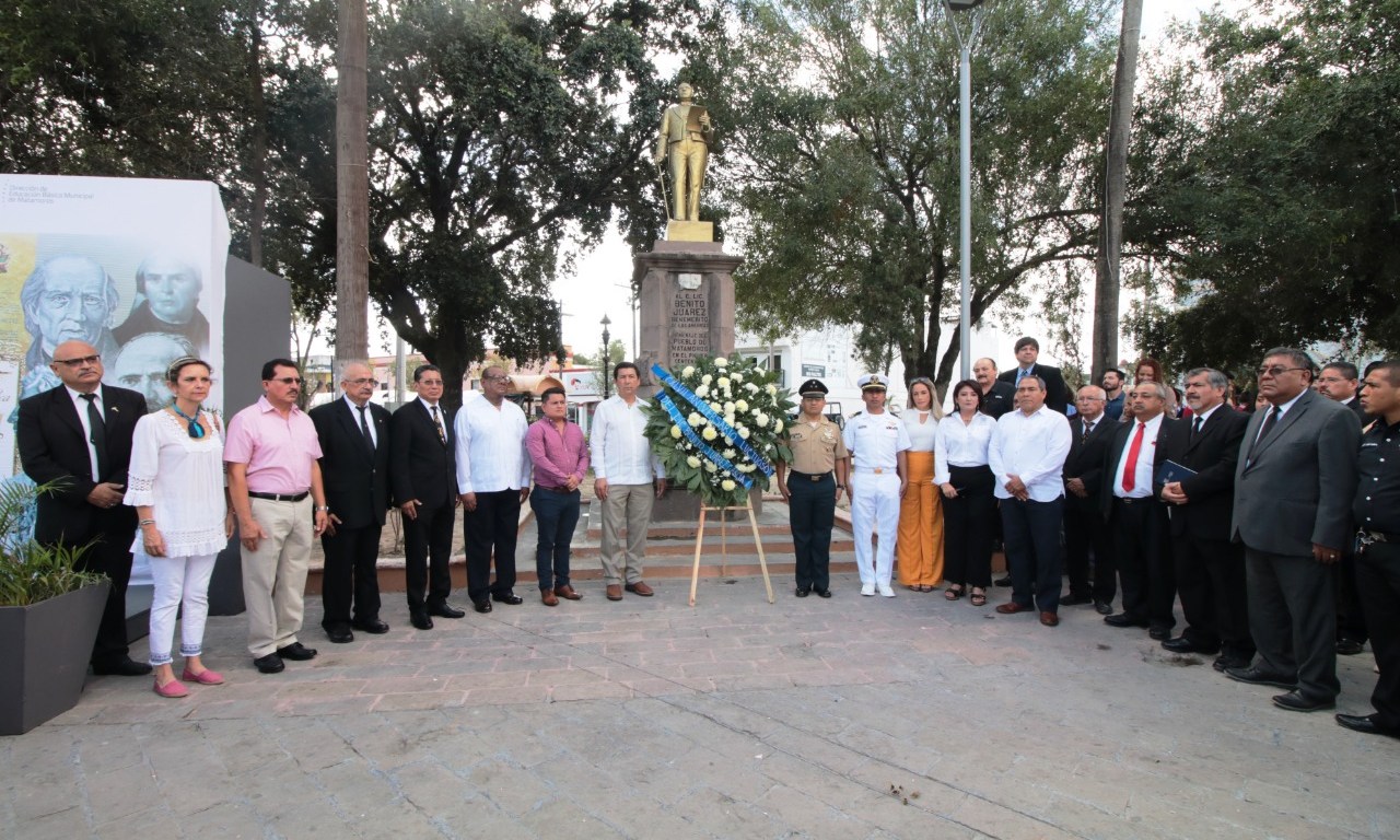 Al encabezar este jueves la ceremonia conmemorativa del CXLVII aniversario luctuoso del Lic. Benito Juárez García, el alcalde Mario Alberto López Hernández dijo que en esta frontera se sigue el ejemplo del benemérito de las Américas y se trabaja con una visión clara, de unidad y de respeto por el bienestar de Matamoros y sus familias.