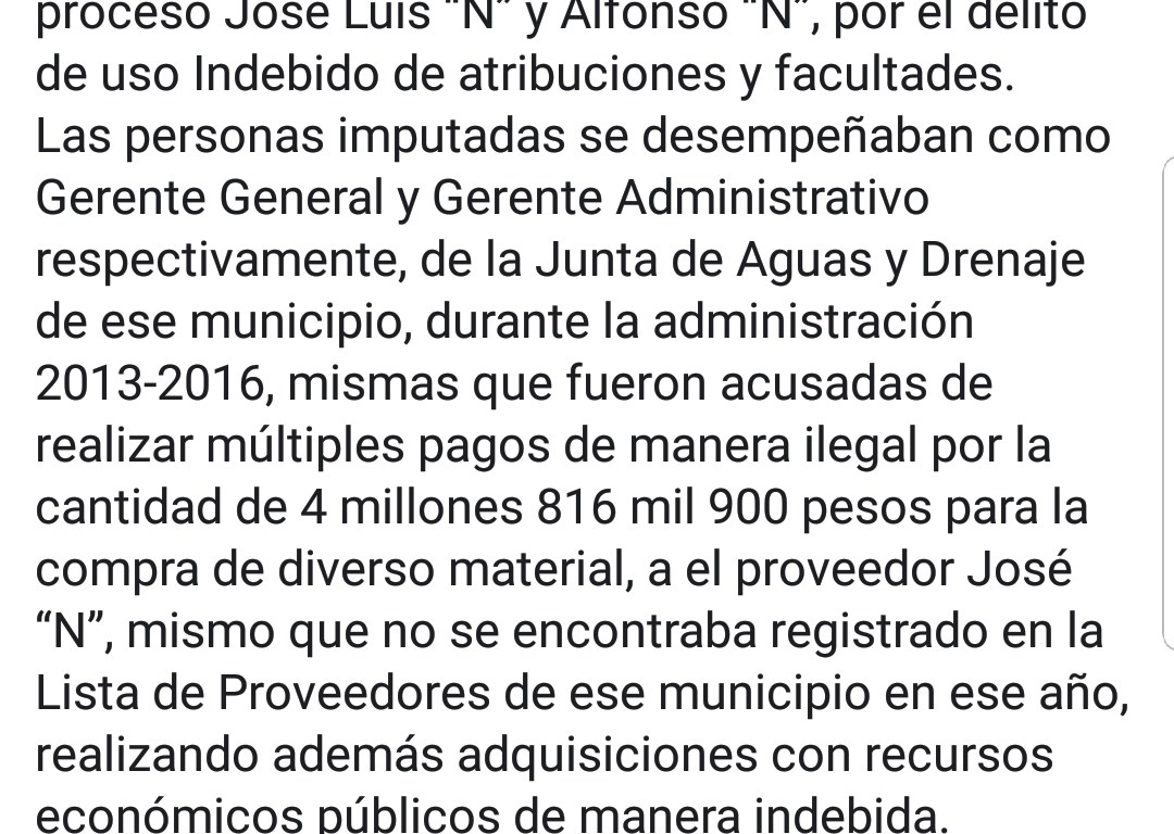 Las personas imputadas se desempeñaban como Gerente General y Gerente Administrativo respectivamente, de la Junta de Aguas y Drenaje de ese municipio, durante la administración 2013-2016, mismas que fueron acusadas de realizar múltiples pagos de manera ilegal por la cantidad de 4 millones 816 mil 900 pesos para la compra de diverso material, a la Proveedora Mirtha “N”, misma que no se encontraba registrada en la Lista de Proveedores de ese municipio en ese año, realizando además adquisiciones con recursos económicos públicos de manera indebida.