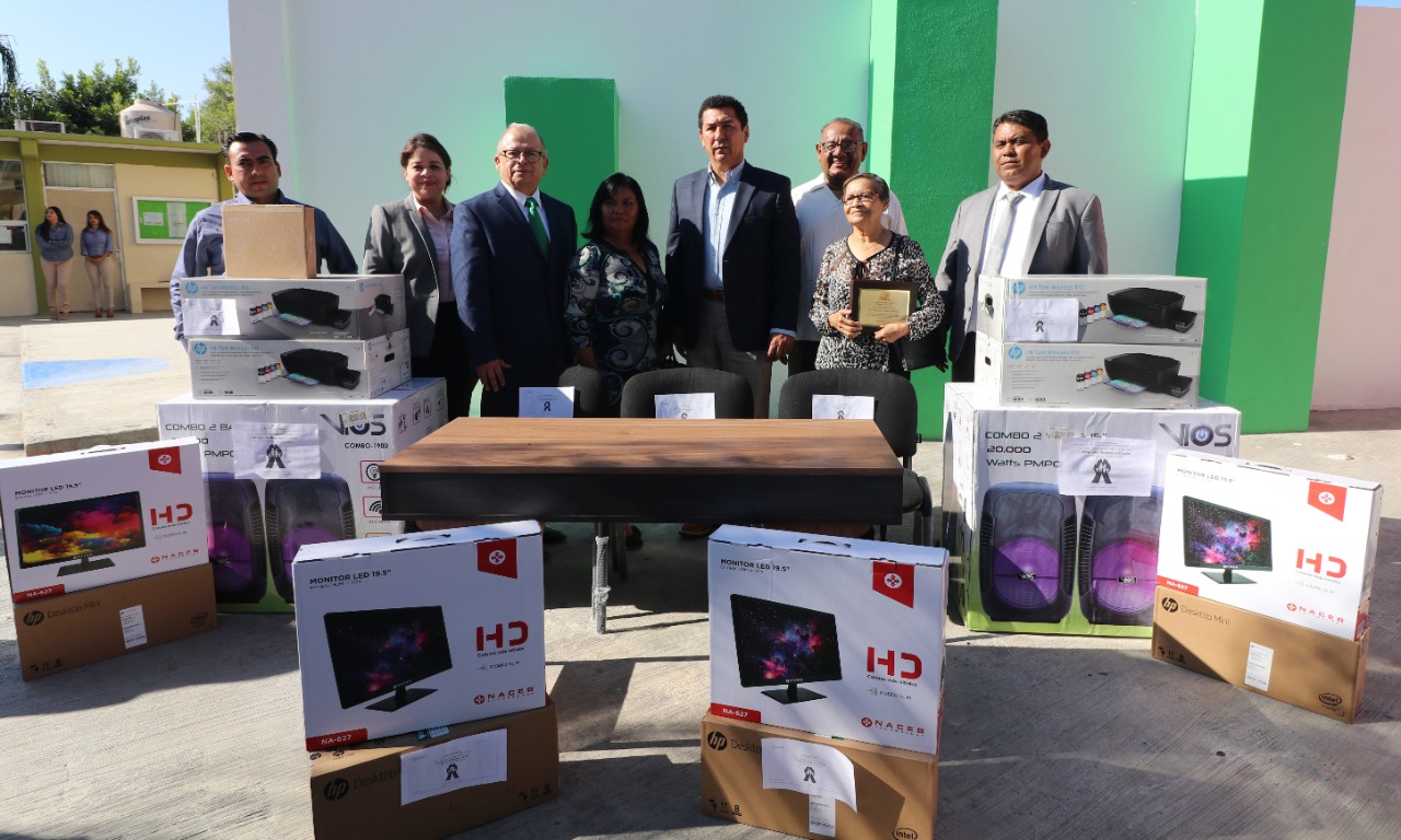 En esa institución que dirige el Profr. Gilberto Cantú Sánchez, el Presidente Municipal entregó: sillas para maestros, escritorios, un aparato de aire acondicionado central de 5 toneladas para 3 aulas, 4 bocinas de 15 pulgadas, un micrófono inalámbrico, 12 lockers con 4 espacios, impresoras y monitores LC entre otros artículos.