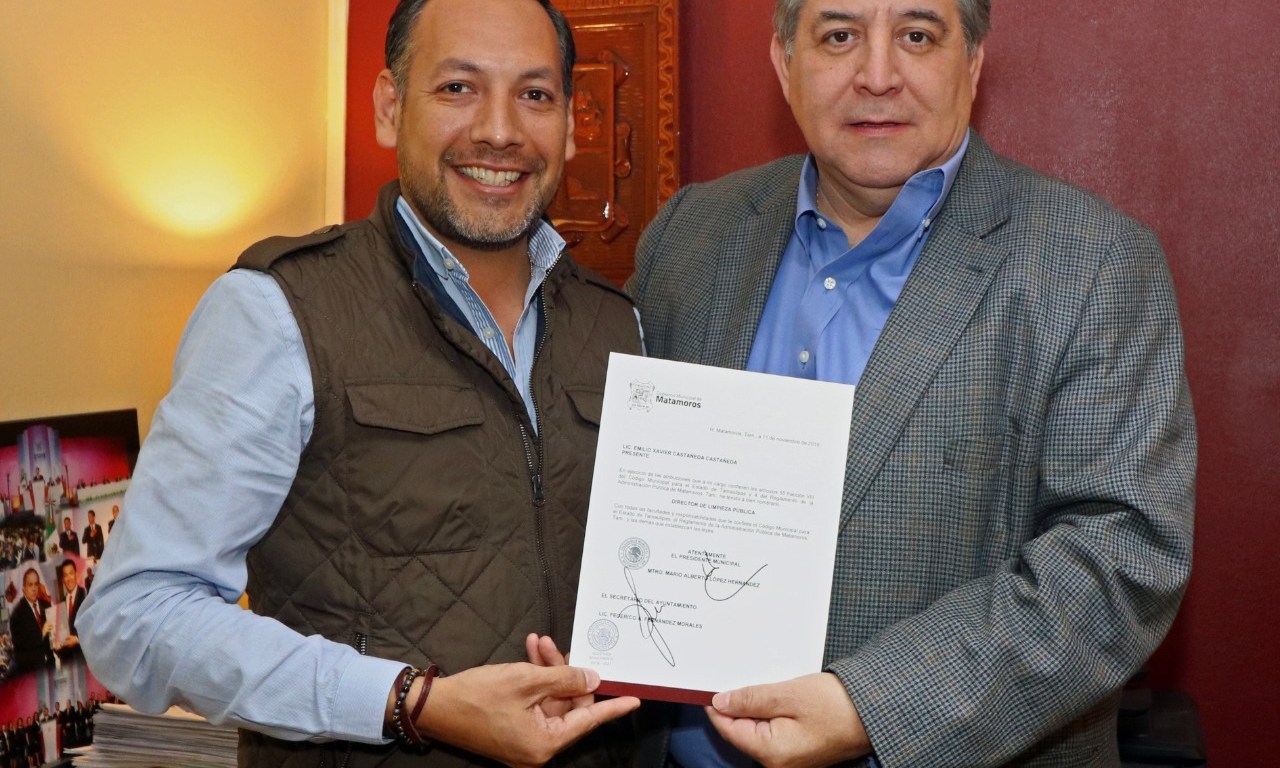 El secretario del Ayuntamiento, Federico Fernández Morales entregó nombramientos a Emilio Castañeda Castañeda, como director de Limpieza Pública y a Manlio Iván Villar Martínez, como director de la Playa Bagdad, a quienes exhortó a cumplir con un alto sentido de responsabilidad las tareas asignadas para beneficio de Matamoros y de sus familias.