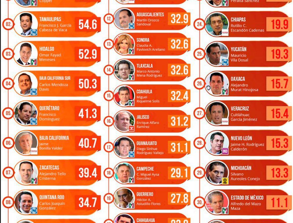 El Gobernador de Tamaulipas, Francisco García Cabeza de Vaca, avanzó una posición en la encuesta mensual de mandatarios que realiza la Consultora Arias, colocándolo como el segundo mejor evaluado del país