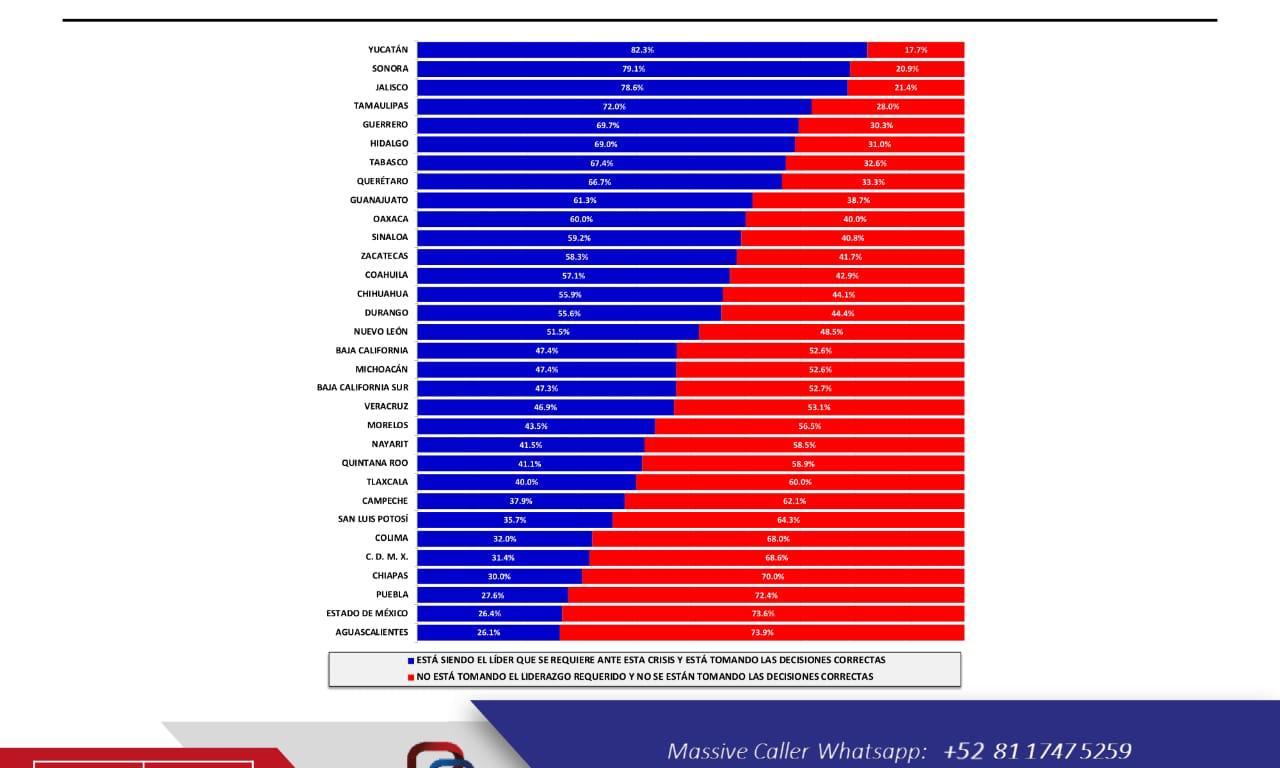 El 72.0 por ciento de los tamaulipecos, aprueba al Gobernador de Tamaulipas, como el líder que se requiere ante esta crisis, por las decisiones tomadas correctamente ante la contingencia de salud pública mundial, así lo demuestra la evaluación de la encuestadora publicada este domingo 22 de marzo.