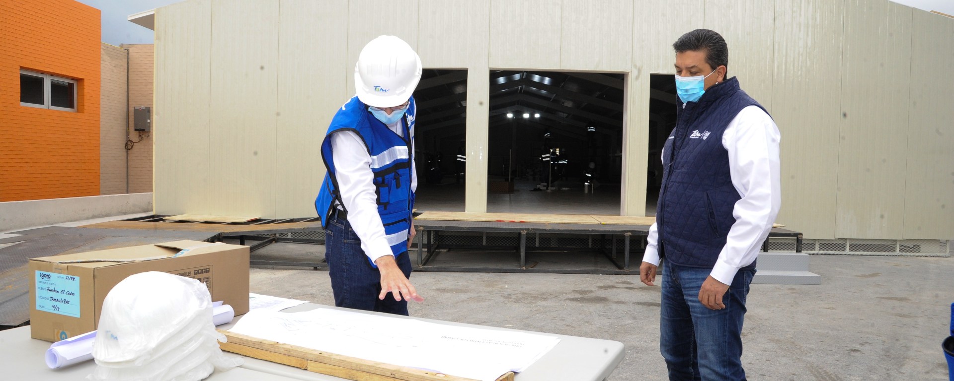 García Cabeza de Vaca supervisó los avances de la construcción del Hospital Móvil COVID-19 que se ubica contiguo al Hospital General de Ciudad Victoria.