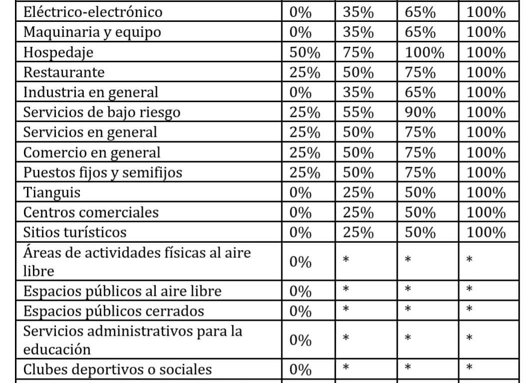 Giros no esenciales, entre los que se encuentran el eléctrico-electrónico, maquinaria y equipo, industria en general, tianguis, centros comerciales, sitios turísticos, actividades físicas al aire libre, servicios administrativos para la educación, clubes deportivos o sociales, servicios inmobiliarios y de alquiler y actividades en espacios públicos al aire libre o cerrados no podrán reactivarse en la primera fase.