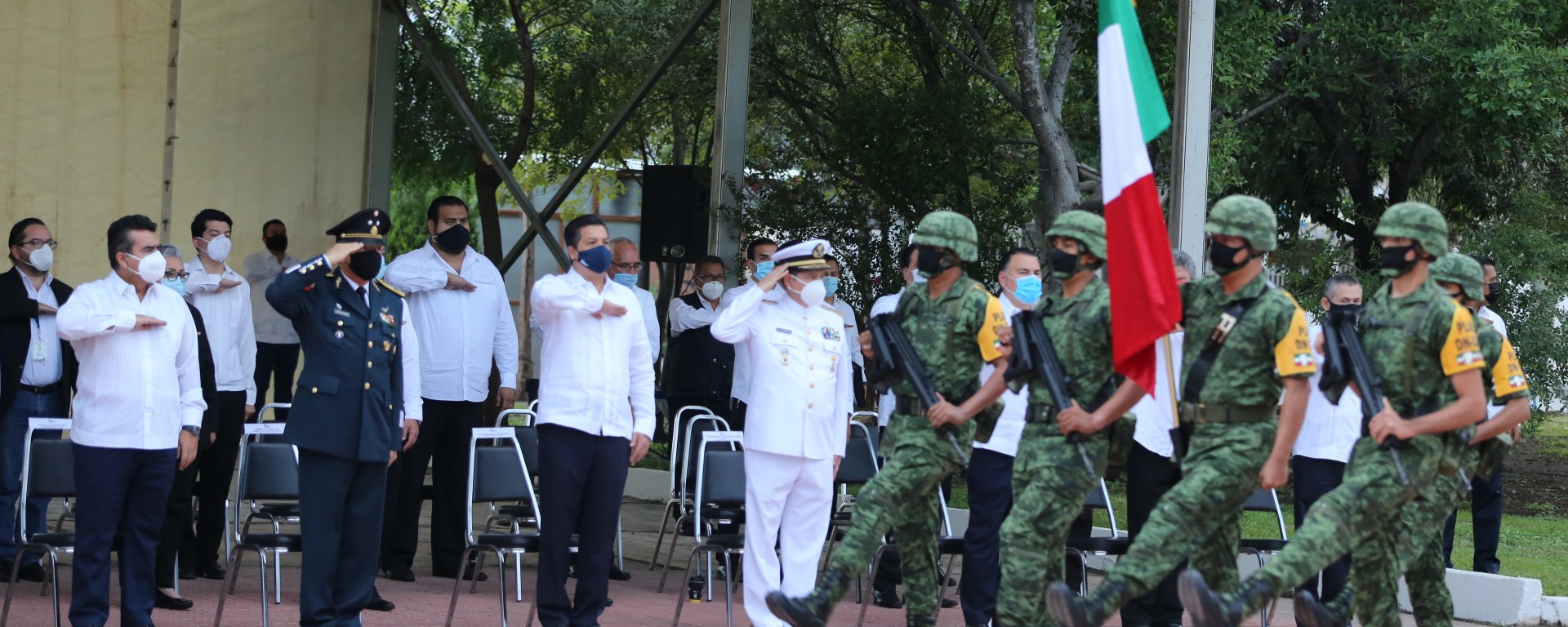 El mandatario estatal, acompañado de los Poderes Legislativo y Judicial en la entidad, de mandos de las Fuerzas Armadas, de la Defensa Nacional, la Marina, la Guardia Nacional y Seguridad Pública del Estado y servidores públicos estatales, colocaron una ofrenda floral y montaron guardia honor, junto al esfinge de los héroes de la patria.