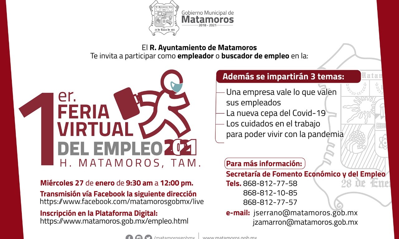 La Secretaría de Fomento Económico y del Empleo del Ayuntamienro informó que los participantes también podrán participar en tres pláticas que se transmitirán a través de la siguiente dirección: https://www.facebook.com/matamorosgobmx/live.