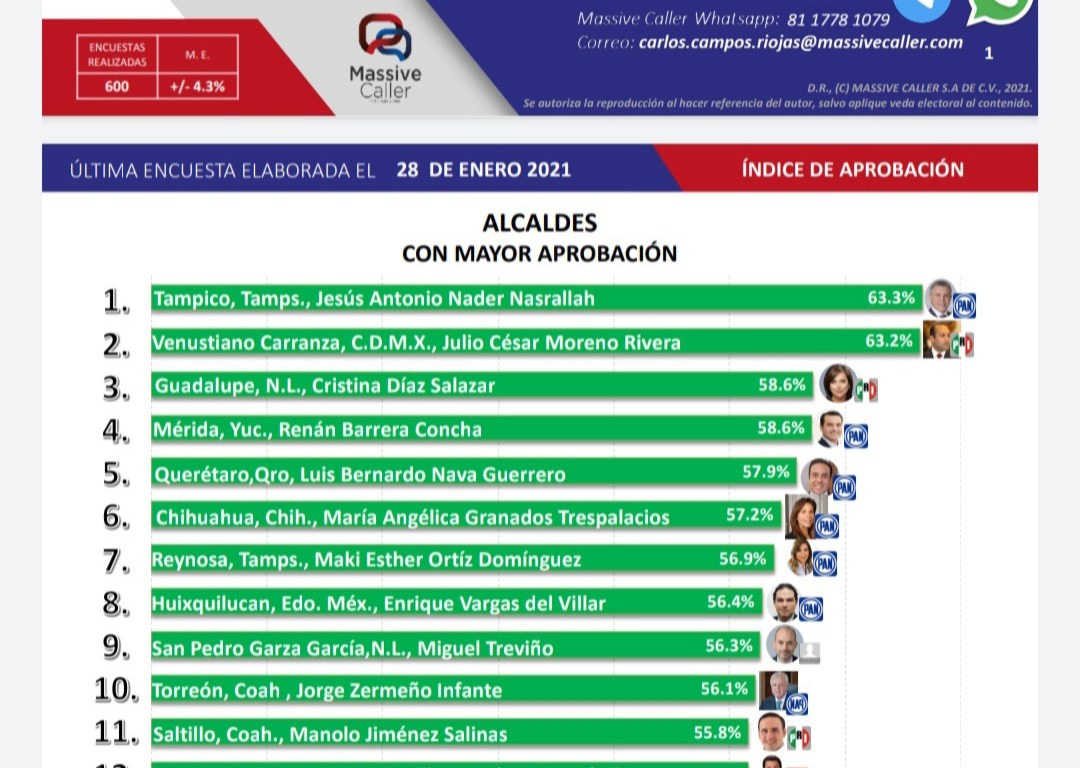 El alcalde de Matamoros, Mario López Hernández aparece entre los mejores 20 presidentes municipales del país, según una encuesta realizada por Massive Caller.
