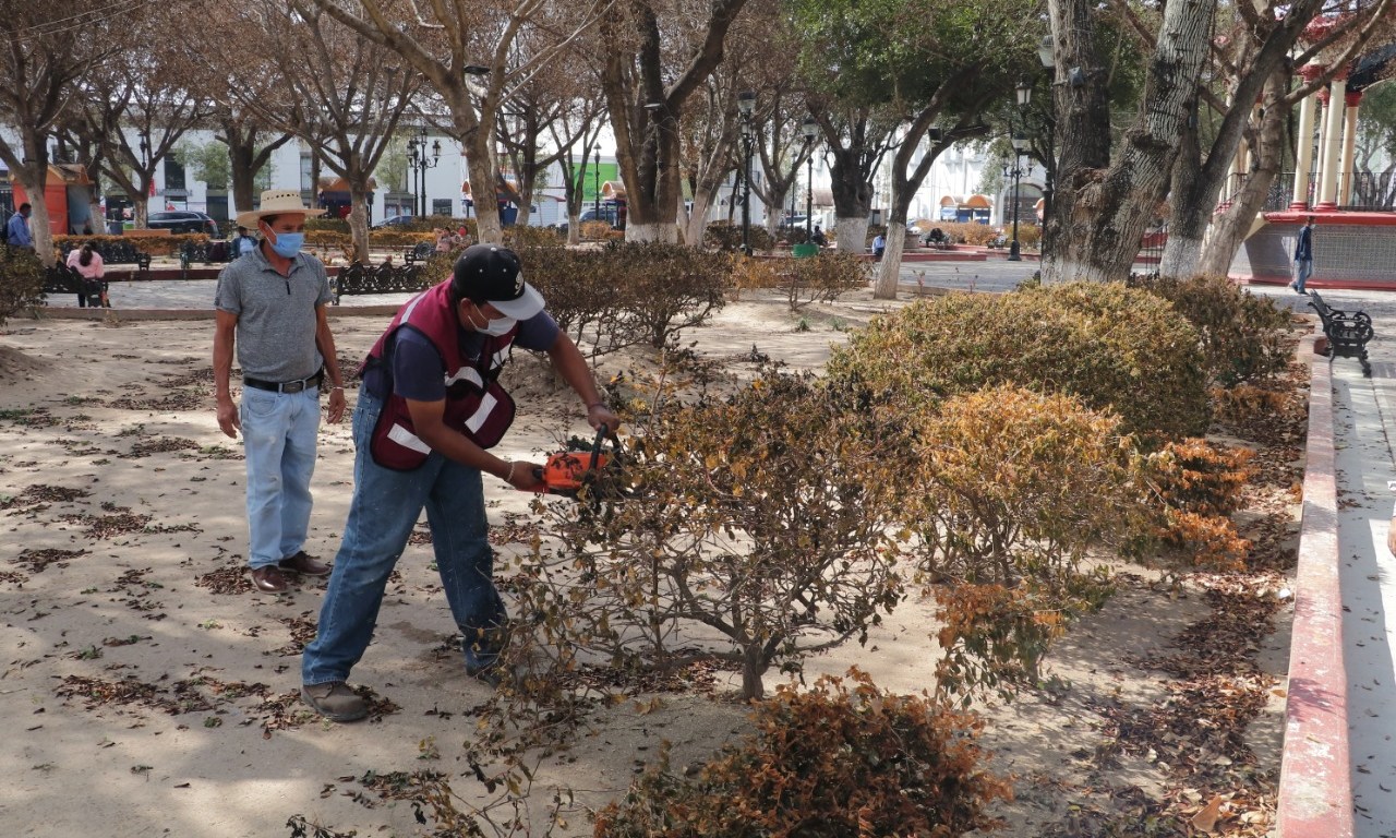Con la finalidad de rescatar las plantas de ornato de la plaza principal “Miguel Hidalgo” que sufrieron daños a causa de la onda gélida que se vivió en la región, este jueves a temprana hora los empleados de Espacios Públicos procedieron a la poda de bugambilias, Durantas, entre otras.
