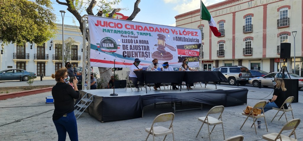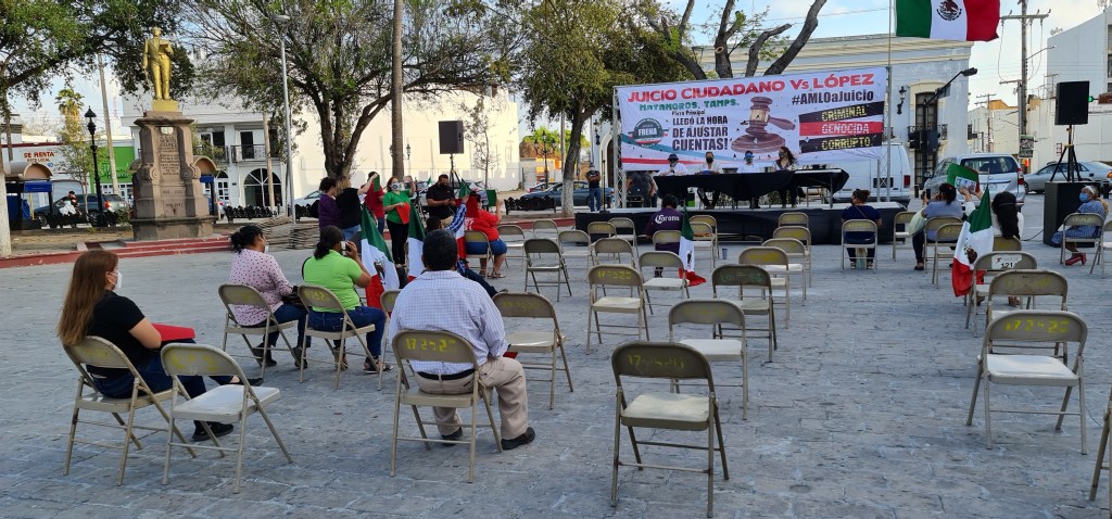 Con poca convocatoria y una desairada asistencia, el Frente Nacional Anti AMLO, llevó a cabo en la Plaza Principal de Matamoros un juicio en contra del presidente de la República.Durante en evento, fueron muy pocas las personas que asistieron, pese a que los organizadores comentaron que se había hecho una convocatoria por medio de redes sociales.Sin embargo quienes lo enguciaron fueron puras mujeres que estaba en el «litigio» ya que había una Jueza; asi como la abogada acusadora y defensora.Al presunto acusado se le leyó todos los delitos que a cometido como gastos del Aeropuerto, la muerte de varios ciudadanos; la inseguridad; tener más pobres en el país; entre otros delitos.Los pocos asistentes fueron quienes se presume decidieron si era culpable o no, por medio de unas cartulinas que se les proprocionaron al iniciar el evento frente a la presidencia municipal.Finalmente lo encontraron culpable de varios delitos entre ellos tener una ingobernabilidad en el país, asi como varios crimenes y dejar libres a delincuentes lo que se llama encubrimiento.Una vez que concluyó el evento las damas se retiraron junto con varios vehículos que en sus vidros pedían al presidente Andrés Manuel López Obrardo que deje su cargo.