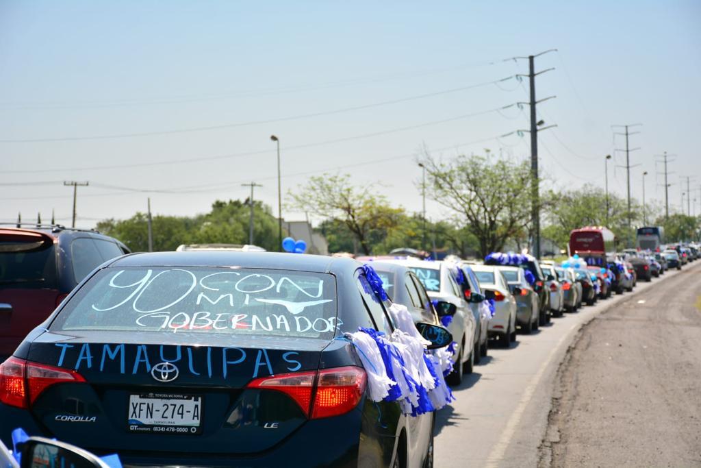 En sus unidades, exhibieron leyendas como #YoConMiGobernador, #TamaulipasEsMiOrgullo y Tamaulipecos con Cabeza, #NiUnPasoAtrás #TotalRespaldoAlGobernador, desfilando de manera simultánea por las principales calles de las distintas ciudades del estado.
