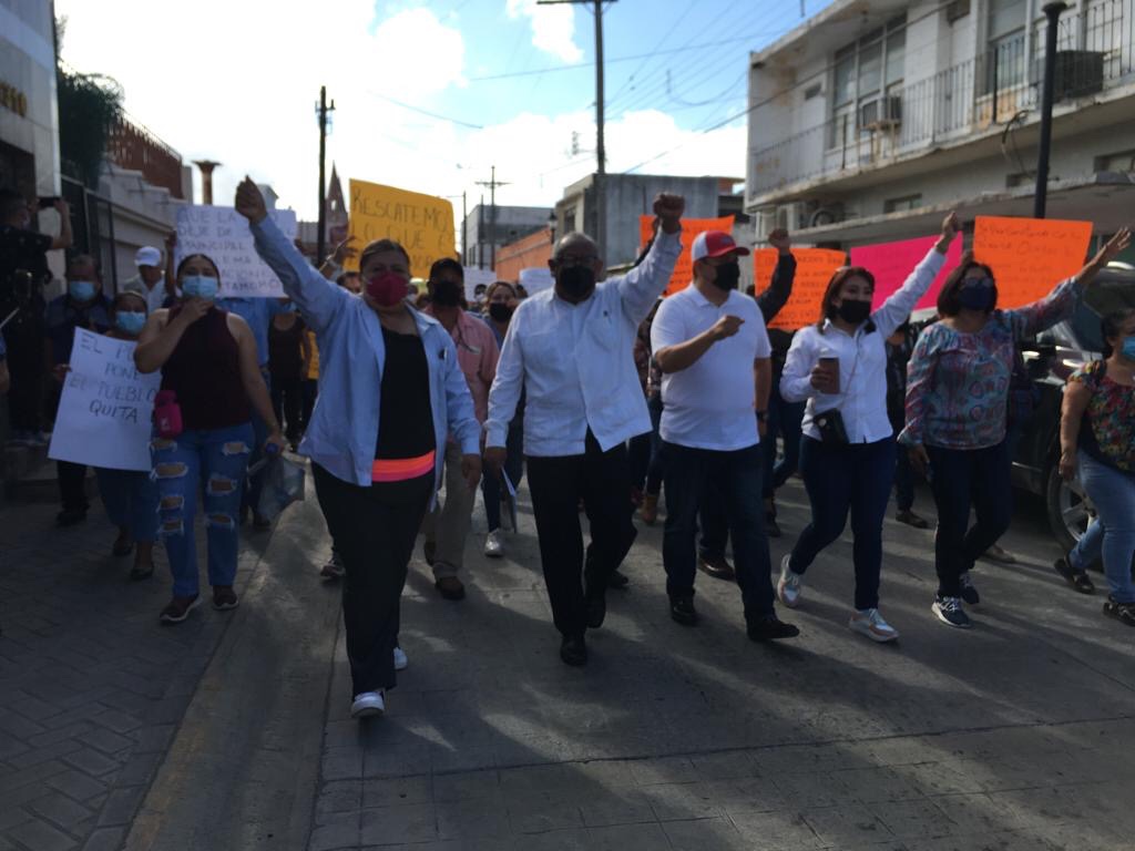 La primera marcha convocada por sinidcos y regidores del Ayuntamiento donde piden la salida del gerente general de la Junta de Aguas y Drenaje de Matamoros, Rodolfo Simón Hernández Piña, se realizó la mañana de este jueves.Los colonos; comerciantes y empresarios fueron convocado en la plaza principal de Matamoros para llevar a cabo la marcha hasta las instalaciones de la planta 1 de la para municipal.Fue asi como cientos de matamorenses iniciaron la marcha por la calle quinta, hasta llegar a la avenida Alvaro Obregón y luego tomar la calle Galeana hasta llegar hasta las instalaciones de la planta 1 de la Junta de Aguas.Ahí el regidor Jorge Rentería Campos, presidente de la Comisión de la Junta de Aguas en el cabildo no solo pidió la destitución de gerente, sino que atendieran varios casos de la ciudadanía donde hay cobros de mas.»Estamos aqui no solo para pedir la destitución del gerente de la Junta de Aguas, sino también que nos atiendan las peticiones y problemas que presentan los colonos», expresó.Hubo un momento que la líder de las colonias que son invasiones de nombre Estela quiso aguitar a la gente para que entrarar de forma violenta, sin embargo los mismos organizadores de lo impidieron.Finalmente quien agradeció la presencia de los colonos fue el segundo síndico Alejandro Villafañez Zamudio, quien pidió que se lleve a cabo otra sesión del consejo ya que la enterior fue ilegal segúb su dicho.Una vez concluida la manifestación no salió ningún funcionarios de la Junta de Aguas, por lo que pactaron de llevar a cabo una reunión durante el día.