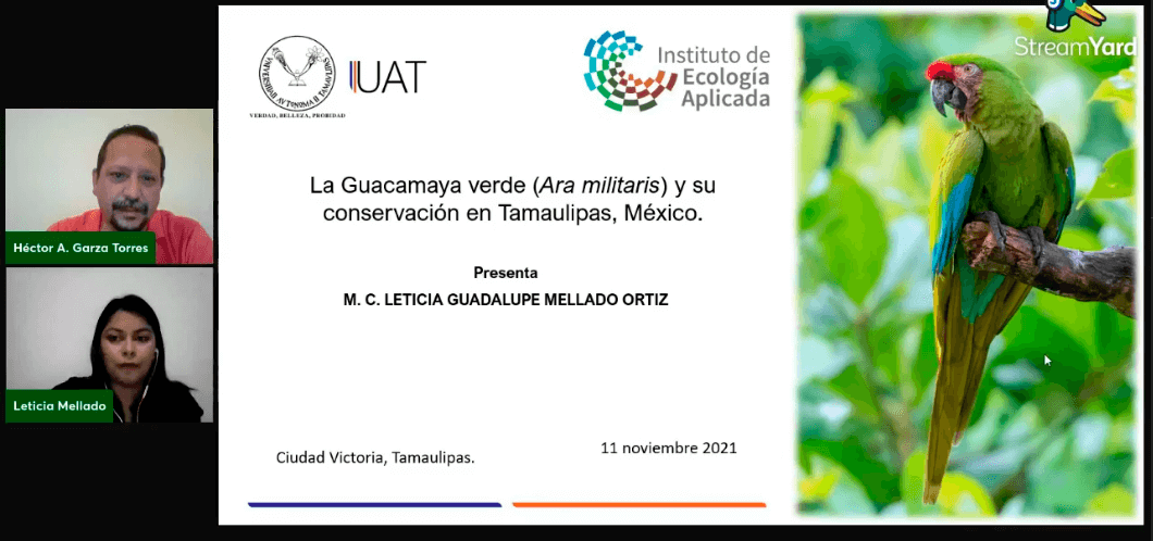 La Maestra en Ecología y Recursos Naturales por la UAT, Mellado Ortiz impartió la conferencia virtual “La Guacamaya Verde (Ara militaris) y su estado de conservación en Tamaulipas, México”, donde habló del trabajo que está realizando en colaboración con investigadores de la casa de estudios para la conservación de esta especie.