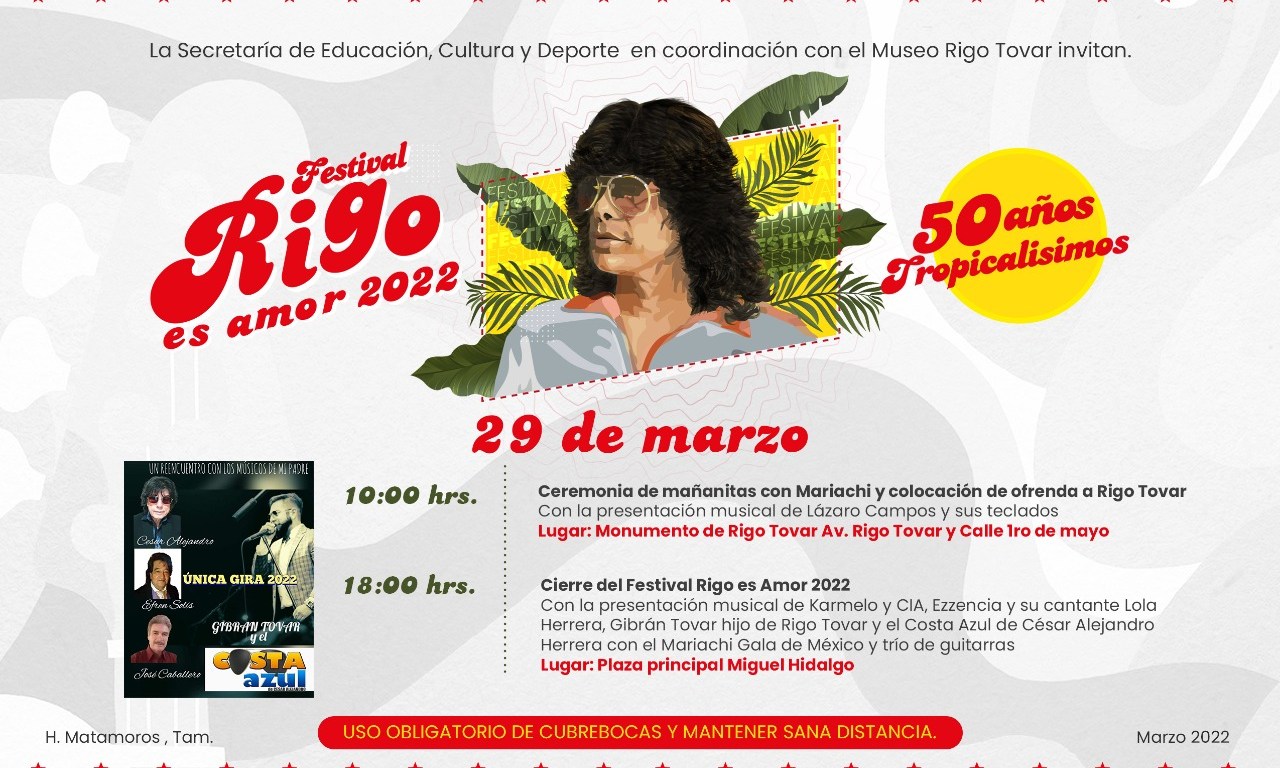 La Secretaría de Educación Cultura y Deporte de Matamoros del Ayuntamiento de Matamoros, llevará a cabo un homenaje al ídolo Rigo Tovar por medio de un Festival.
