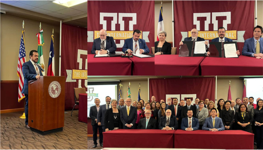 En este contexto se llevó a cabo la firma de un memorando de entendimiento por el C. P. Guillermo Mendoza Cavazos, Rector de la UAT, y el Dr. Pablo Arenaz, presidente de la TAMIU, durante la ceremonia realizada en las instalaciones del Centro Binacional de esa universidad norteamericana, con sede en la ciudad de Laredo, Texas, en Estados Unidos.