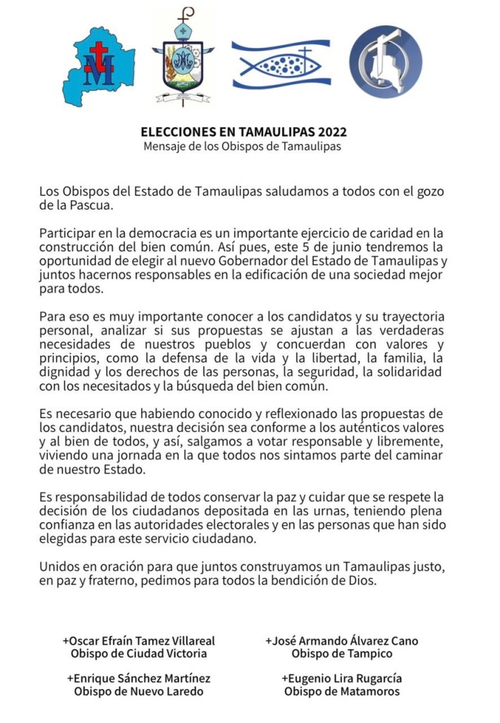 La carta es firmada por Oscar Efraín Tamez Villarreal, obispo de Ciudad Victoria; Enrique Sánchez Martínez, de Nuevo Laredo; José Armando Álvarez Cano, de Tampico y Eugnio Andrés Lira Rugarcía.