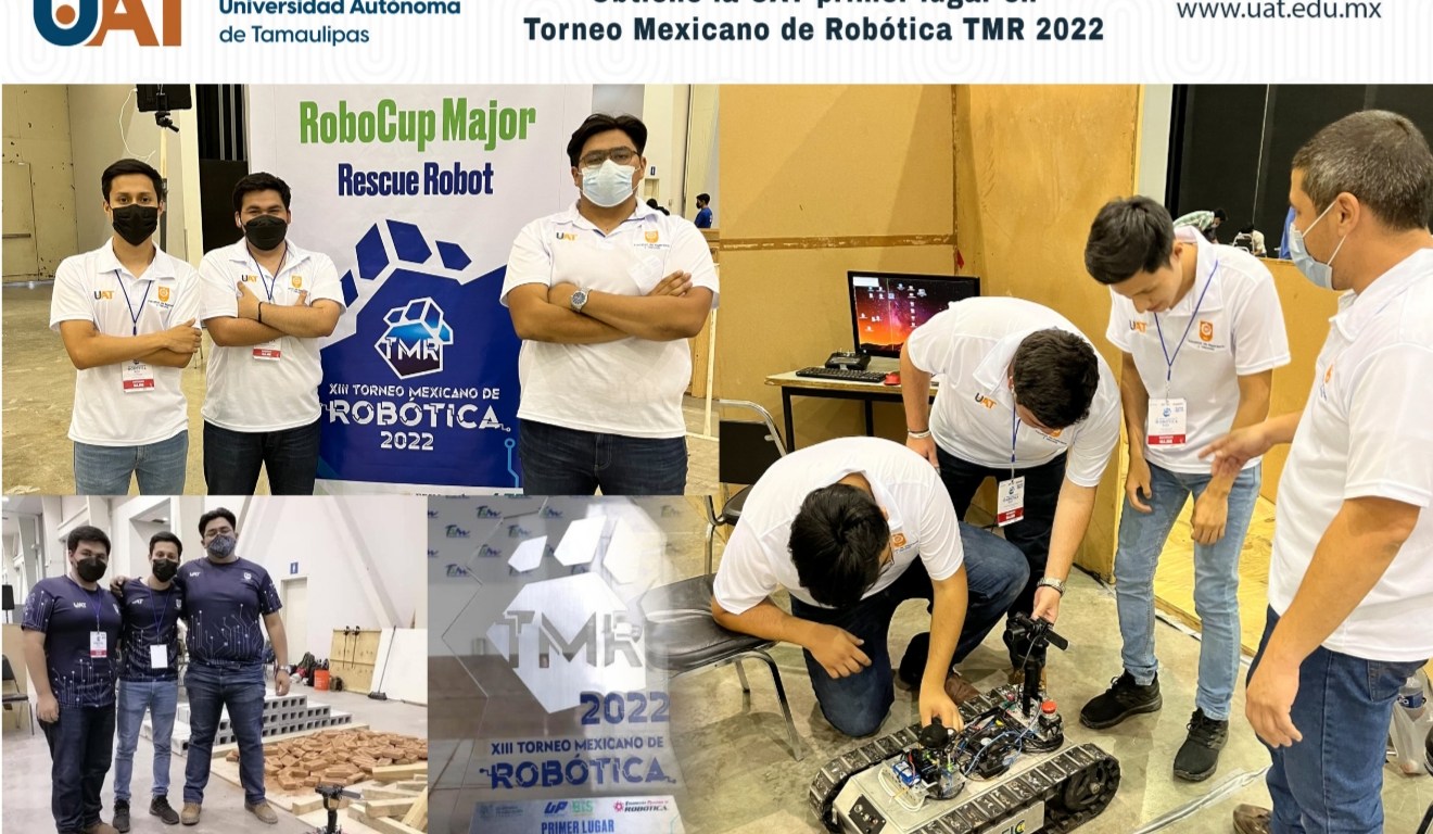 Estudiantes de la Facultad de Ingeniería y Ciencias (FIC) de la Universidad Autónoma de Tamaulipas (UAT) obtuvieron el primer lugar en dos categorías del XIII Torneo Mexicano de Robótica (TMR) 2022, que se realizó del 19 al 21 de mayo en el Polyforum de Ciudad Victoria.