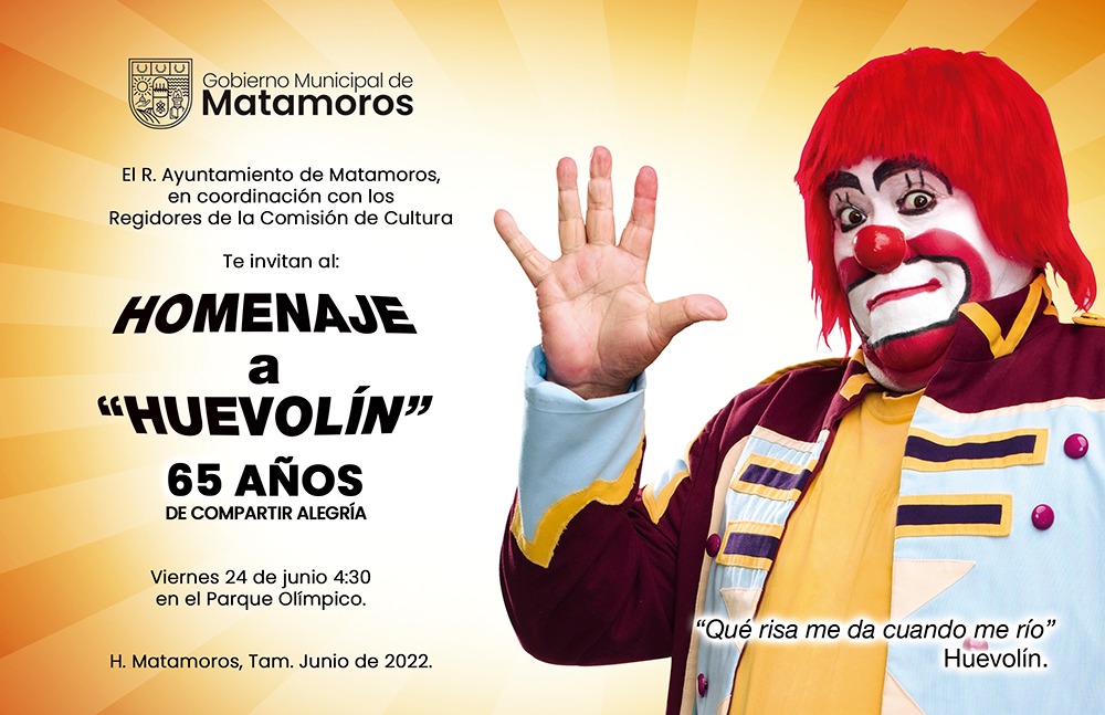 Invitación a las familias matamorenses para asistir al reconocimiento a la trayectoria artística del Payaso «Huevolín», el próximo 24 de Junio a las 16:30 horas en el parque olímpico.