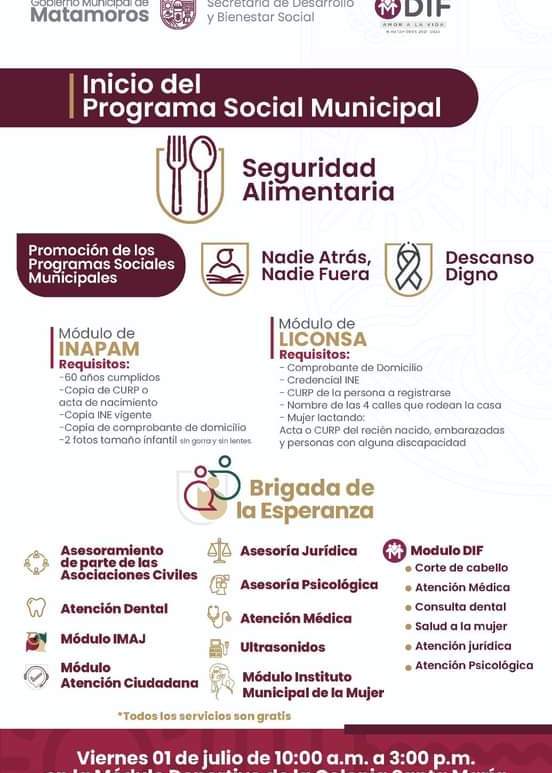 HOY INICIA PROGRAMA DE SEGURIDAD ALIMENTARIA El Ayuntamiento de Matamoros iniciará el programa de Seguridad Alimentaria este viernes.Habrá diferentes módulos de información en la colonia Santa María. Todos invitados. Continúa leyendo HOY INICIA PROGRAMA DE SEGURIDAD ALIMENTARIA