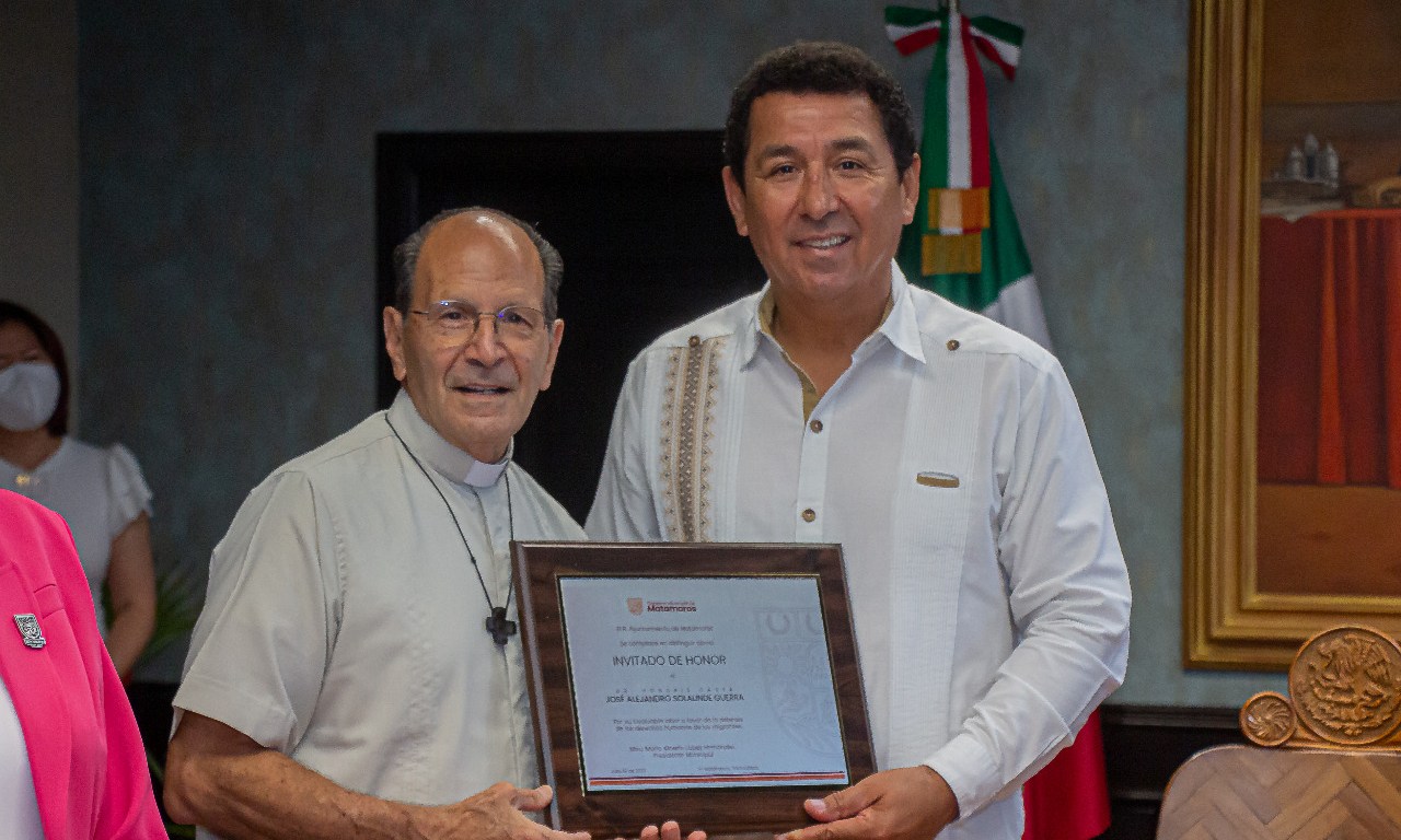 El alcalde Mario Alberto López Hernández acompañado por integrantes del Republicano Ayuntamiento recibió en la Presidencia Municipal de Matamoros al Dr. Honoris Causa, José Alejandro Solalinde Guerra, a quien le reconoció su labor y lucha como defensor de los derechos humanos de los migrantes.