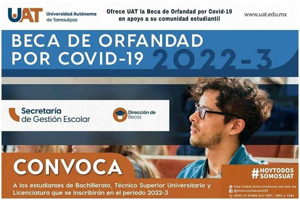 Con la finalidad de brindar apoyo a la comunidad estudiantil, la Universidad Autónoma de Tamaulipas abrió la convocatoria “Beca de Orfandad por COVID 19”, dirigida a sus estudiantes de bachillerato, licenciatura y técnico superior universitario, que hayan perdido a su padre, madre o ambos a causa de COVID-19.