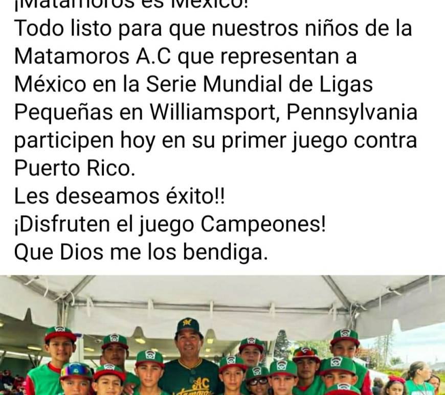 En triunfo del primer juego en Williamsport Pensilvania de los niños de la Matamoros A.C. Fue destacada por el alcalde de Matamoros, Mario López Hernández. Continúa leyendo DESTACA ALCALDE TRIUNFO DE NIÑOS DE LA MATAMOROS A. C.