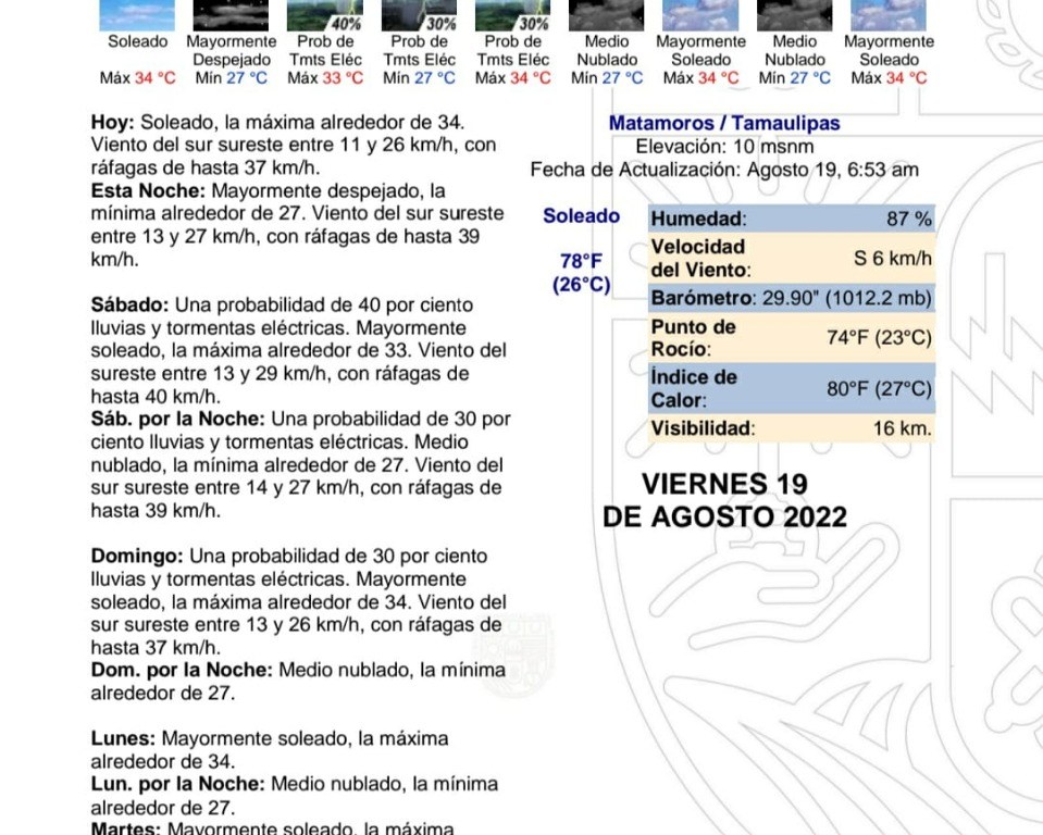 El Gobierno de Matamoros a través de la Dirección de Protección Civil a cargo de Jorge Orizaga Castañeda informa que el pronóstico de lluvias para este fin de semana, es de un 40% para el sábado y un 30% para el domingo.