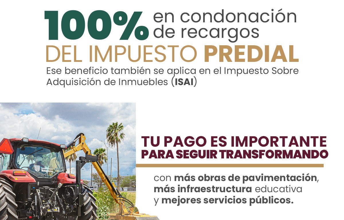 El Ayuntamiento de Matamoros está ofreciendo el 100 por ciento descuento a los recargos del impuesto predial.