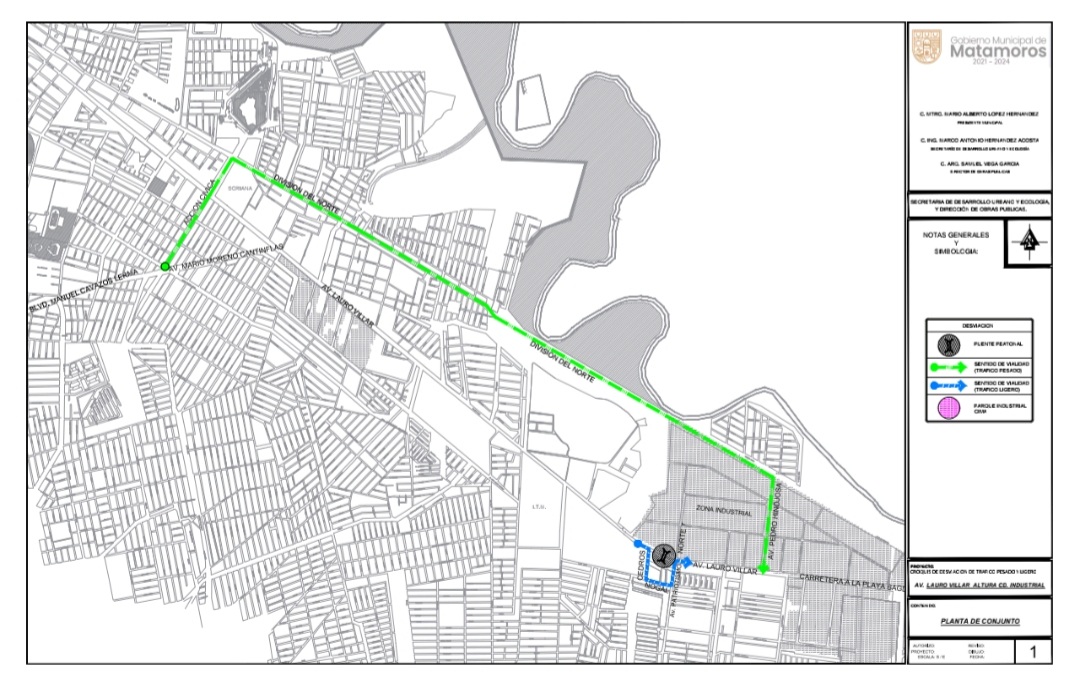 El Gobierno Municipal de Matamoros informa que a partir de las 6:00 horas de este sábado y hasta las 18:00 horas del mismo día, uno de los tramos de la avenida Lauro Villar será cerrado a la circulación a fin de que Comité de Mejoras del Parque Ciudad Industrial concluya los trabajos del puente peatonal, los cuales tenía inconclusos desde hace varios años.