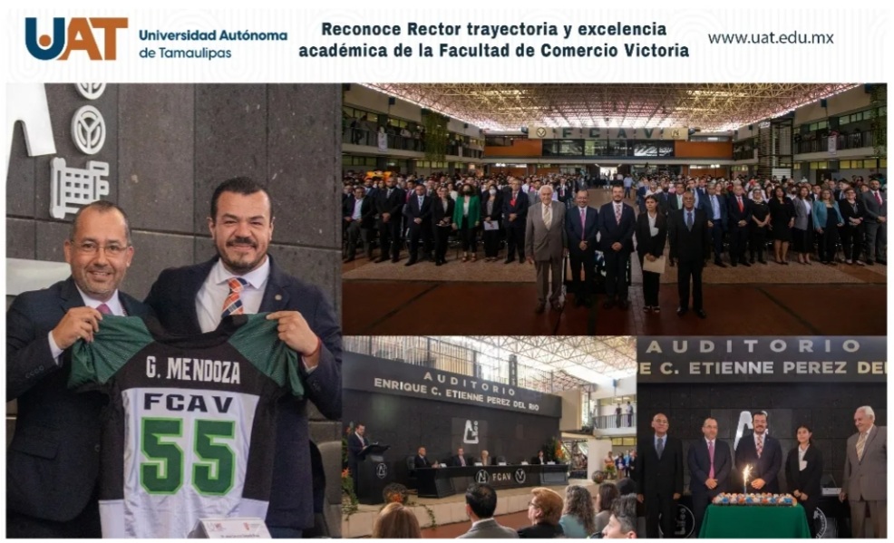 Ciudad Victoria, Tam.- La Facultad de Comercio y Administración Victoria (FCAV) llevó a cabo la ceremonia conmemorativa del quincuagésimo quinto aniversario de su fundación, acto en que el C. P. Guillermo Mendoza Cavazos, Rector de la Universidad Autónoma de Tamaulipas (UAT), reconoció la trayectoria y excelencia académica de ese plantel universitario.