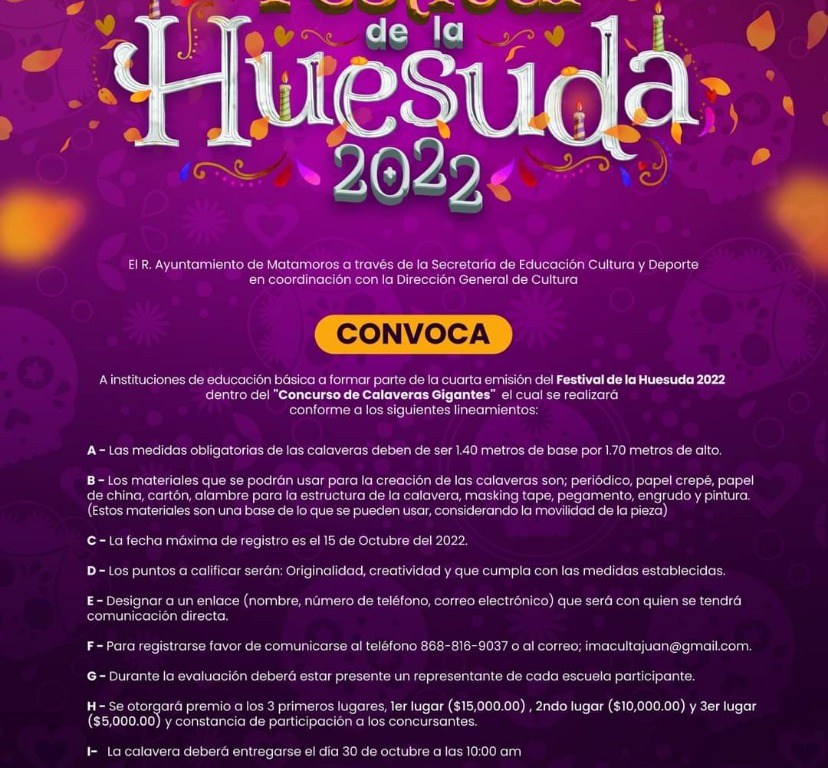 El Gobierno de Matamoros a través de la Secretaría de Educación, Cultura y Deporte en coordinación con la Dirección General de Cultura convoca a las instituciones de educación básica, a participar en el “Concurso de Calaveras Gigantes” que se organiza en el marco del Festival de la Huesuda 2022.