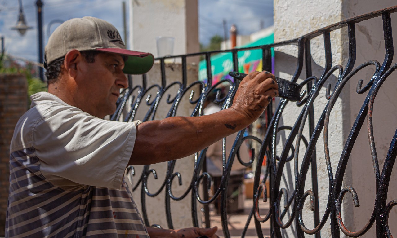 Este día los empleados trabajan en el pintado de barandales y estructura del kiosko de la citada zona comercial.