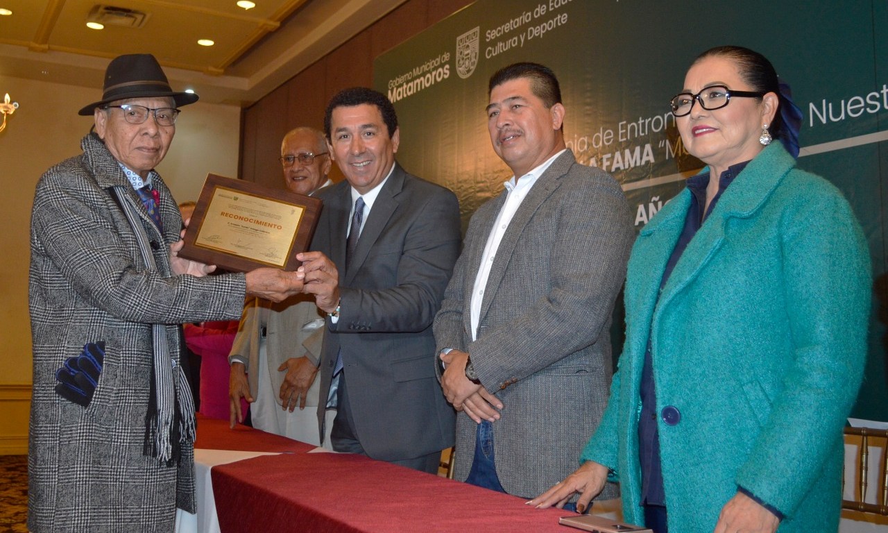 En presencia de Manuel Raga Navarro, reconocido exjugador de baloncesto y hoy Director del Instituto del Deporte en Tamaulipas, el Presidente Municipal entregó reconocimientos a los entronizados al Salón de la Fama: Ernesto “Zurdo” Ortega Cabrera, por sus trayectoria en beisbol, así como también a Alberto Faz “Yaki” Juárez, en lucha libre.