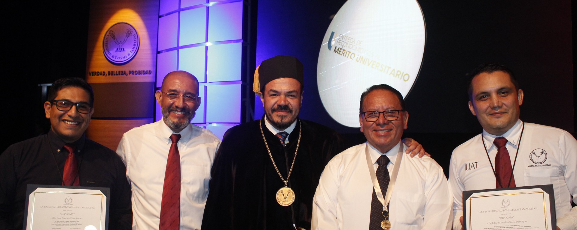 El docente e investigador universitario recibió el galardón de manos del C. P. Guillermo Mendoza Cavazos, rector de la UAT, durante la Ceremonia de Entrega de Reconocimiento al Mérito Universitario llevada a cabo en el Aula Magna Herman H. Fleishman del Centro Universitario Sur.