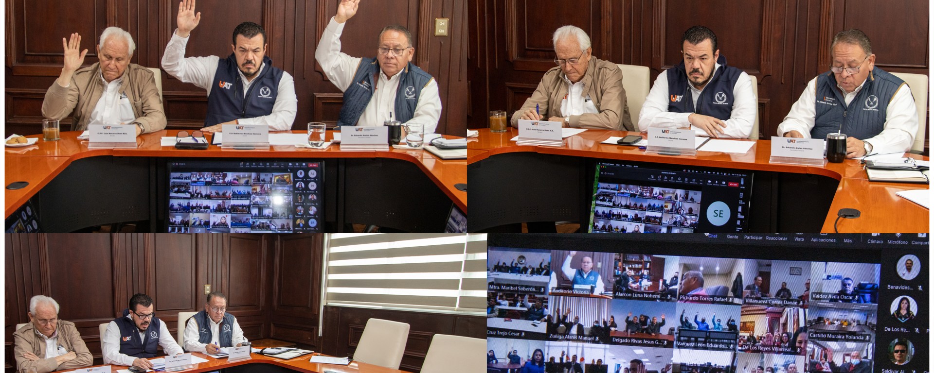 La reunión se desarrolló en modo virtual y se trasmitió desde la sala de juntas de la Rectoría, con la asistencia presencial del C. P. Guillermo Mendoza Cavazos, rector de la UAT, como presidente de la Asamblea Universitaria, acompañado del Dr. Eduardo Arvizu Sánchez, secretario general, y del C. P. Luis Navarro Roso, decano de la Universidad.