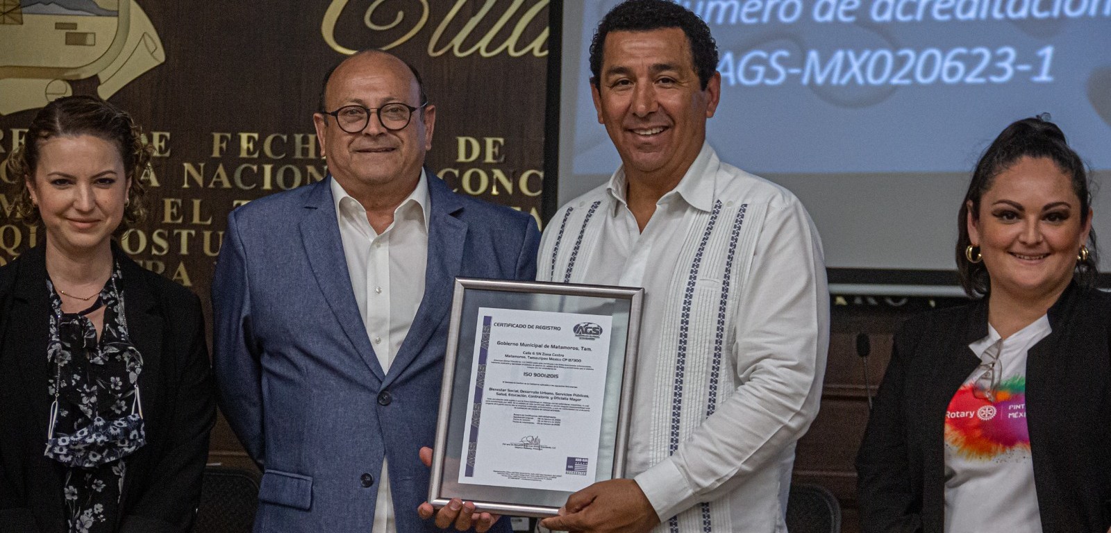 Esta tarde Matamoros se convirtió en el primer municipio de Tamaulipas en recibir la certificación ISO 9001:2015 otorgada por el organismo certificador American Global Standards, presea que recibió el Alcalde Mario Alberto López Hernández.