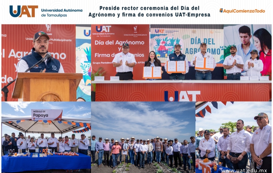 El C.P. Guillermo Mendoza Cavazos, rector de la Universidad Autónoma de Tamaulipas (UAT), presidió en el campo experimental La Posta, de la Unidad Académica Multidisciplinaria Mante (UAM Mante), la ceremonia conmemorativa universitaria por el Día del Agrónomo y la firma de convenios Universidad-Empresa con organismos del sector productivo del sur de Tamaulipas.