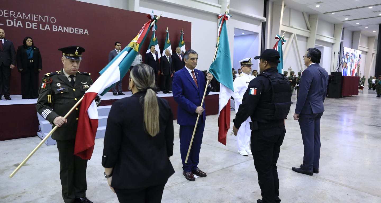 “En nuestra enseña nacional se contiene un proyecto de futuro con un horizonte abierto a las transformaciones que hoy estamos construyendo, gracias a que hemos restaurado la confianza de la sociedad en un gobierno humanista, promotor de los derechos humanos, honesto y que cumple y hace cumplir la ley, con un renovado sentido de patriotismo y responsabilidad”, expresó el gobernador durante una emotiva ceremonia cívica en el Polyforum de esta capital, en la que entregó la bandera a la escolta de la Guardia Estatal de Tamaulipas.