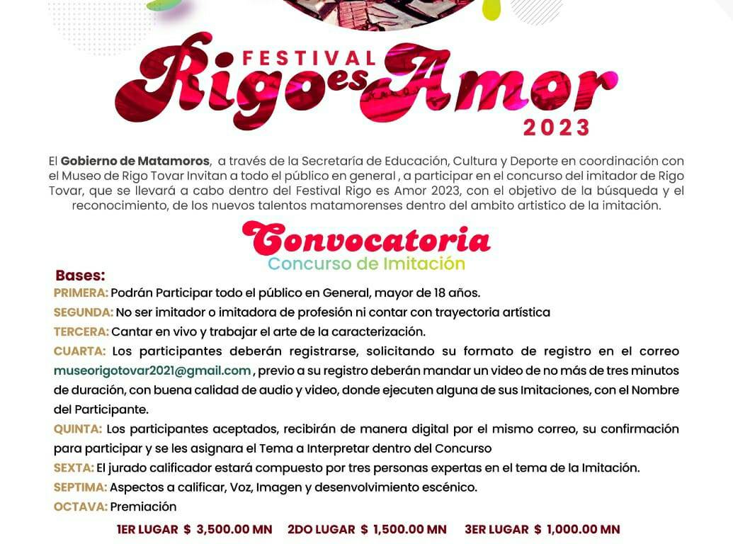 El Gobierno de Matamoros a través del Museo Rigo Tovar, invita a todos los ciudadanos a participar en el concurso de imitación del famoso cantante matamorense, actividad a desarrollarse en el marco del Festival “Rigo es Amor 2023” que se realizará del 29 de marzo al 01 de abril del presente año.
