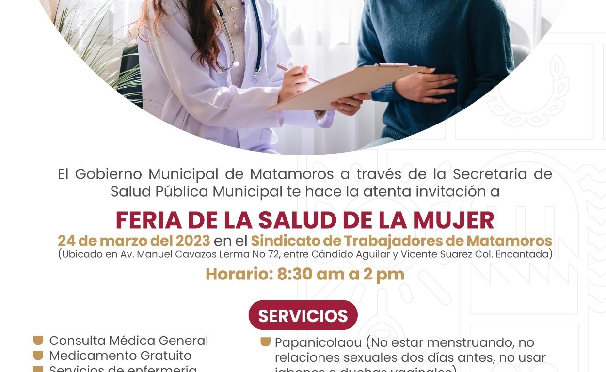 El Gobierno de Matamoros a través de la Secretaría de Salud Municipal invita a la Feria de la Salud de la Mujer que se organiza gratuitamente, con la finalidad de apoyar a toda aquella ciudadana que requiera algún tipo de atención médica.