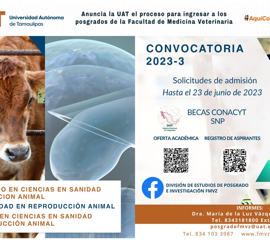 La Universidad Autónoma de Tamaulipas, a través de la Facultad de Medicina Veterinaria y Zootecnia Dr. Norberto Treviño Zapata (FMVZ-UAT), tiene abierto el proceso de admisión de los programas de posgrado, cuya fecha límite para la recepción de solicitudes es el 23 de junio de 2023.  Los programas que se ofertan son la Especialidad en Reproducción Animal, la Maestría en Ciencias en Sanidad y Producción … Continúa leyendo Anuncia la UAT el proceso para ingresar a los posgrados de la Facultad de Medicina Veterinaria