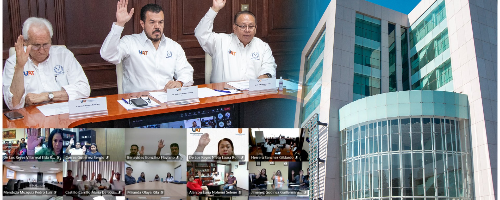 En una sesión desarrollada de manera virtual, el rector Guillermo Mendoza Cavazos presidió los trabajos de la Asamblea Universitaria desde la sala de juntas de la Rectoría en esta capital, acompañado por el secretario general de la Universidad, Dr. Eduardo Arvizu Sánchez; el decano, C. P. Luis Navarro Roso; y la secretaria académica, Dra. Rosa Issel Acosta González.