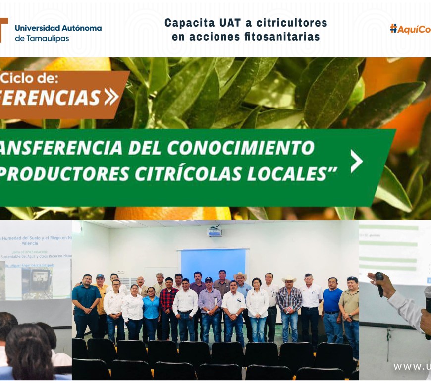 La Universidad Autónoma de Tamaulipas (UAT) organizó, en coordinación con la Asociación Ejidal de Cítricos del municipio de Güémez, Tamaulipas, el ciclo de conferencias denominado “Transferencia del conocimiento para productores citrícolas locales”, en el que se abordaron temas y acciones fitosanitarias que faciliten el control y prevención de plagas y enfermedades en los cultivos. La capacitación surge del acompañamiento a las iniciativas planteadas por el … Continúa leyendo Capacita la UAT a citricultores en acciones fitosanitarias