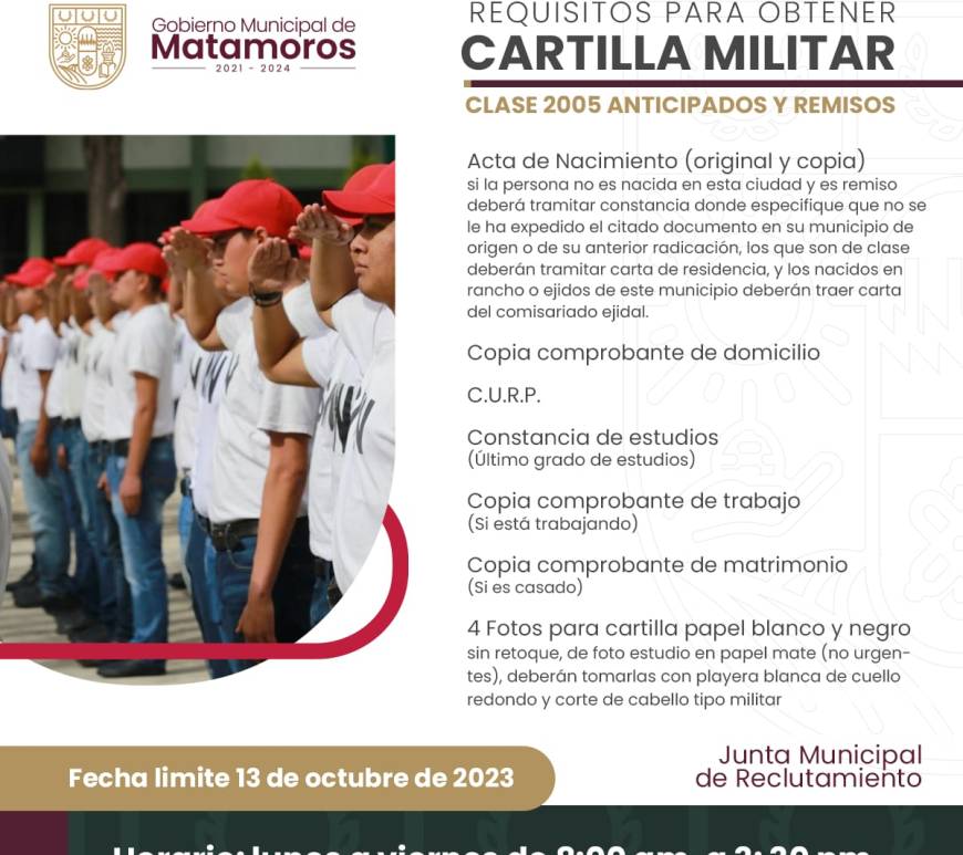 El Gobierno de Matamoros a través de la Junta Municipal de Reclutamiento invita a los jóvenes de la clase 2005 anticipados y remisos a tramitar su cartilla militar. Todos los jóvenes en edad de realizar su servicio militar tiene como fecha límite el 13 de Octubre para presentar su documentación en las oficinas de la Junta Municipal de Reclutamiento, ubicadas en el tercer piso de … Continúa leyendo EXHORTA GOBIERNO DE MATAMOROS A JOVENES DE LA CLASE 2005 ANTICIPADOS Y REMISOS, A TRAMITAR SU CARTILLA MILITAR