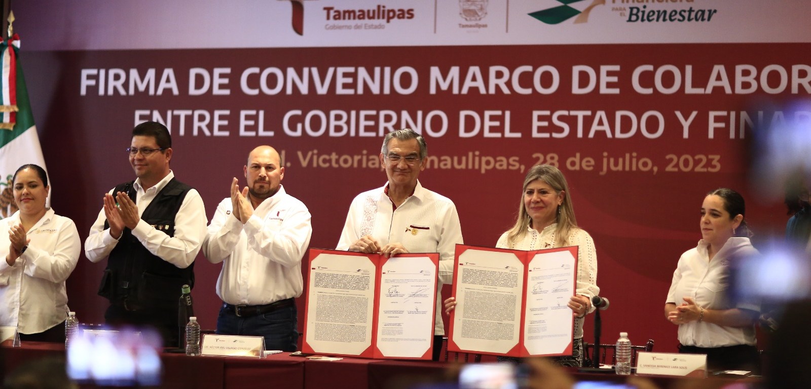 Ciudad Victoria, Tamaulipas.- Para acercar los servicios financieros básicos a las y los tamaulipecos que menos acceso tienen, el gobernador Américo Villarreal Anaya y la directora general de Financiera para el Bienestar, Rocío Mejía Flores firmaron un convenio marco de colaboración, mediante el cual se impulsarán tres esquemas básicos: fomentar el ahorro, acercar apoyos crediticios y el punto primordial, al ser Estado fronterizo, la recepción de remesas.