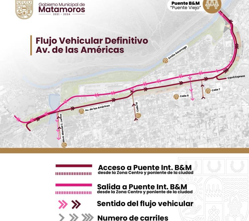El Gobierno de Matamoros avanza en los trabajos que realiza para facilitar el desplazamiento de los vehículos que cruzan de Matamoros a Brownsville, Texas por el puente B&M (puente viejo), los cuales incluyen la reapertura del carril exprés sobre la avenida Alvaro Obregón. Con los trabajos que se realizan se liberará el flujo vehicular de las calles 7 y 8, al reabrir el retorno del … Continúa leyendo Informa Gobierno de Matamoros circulación definitiva en área del Puente Viejo Internacional