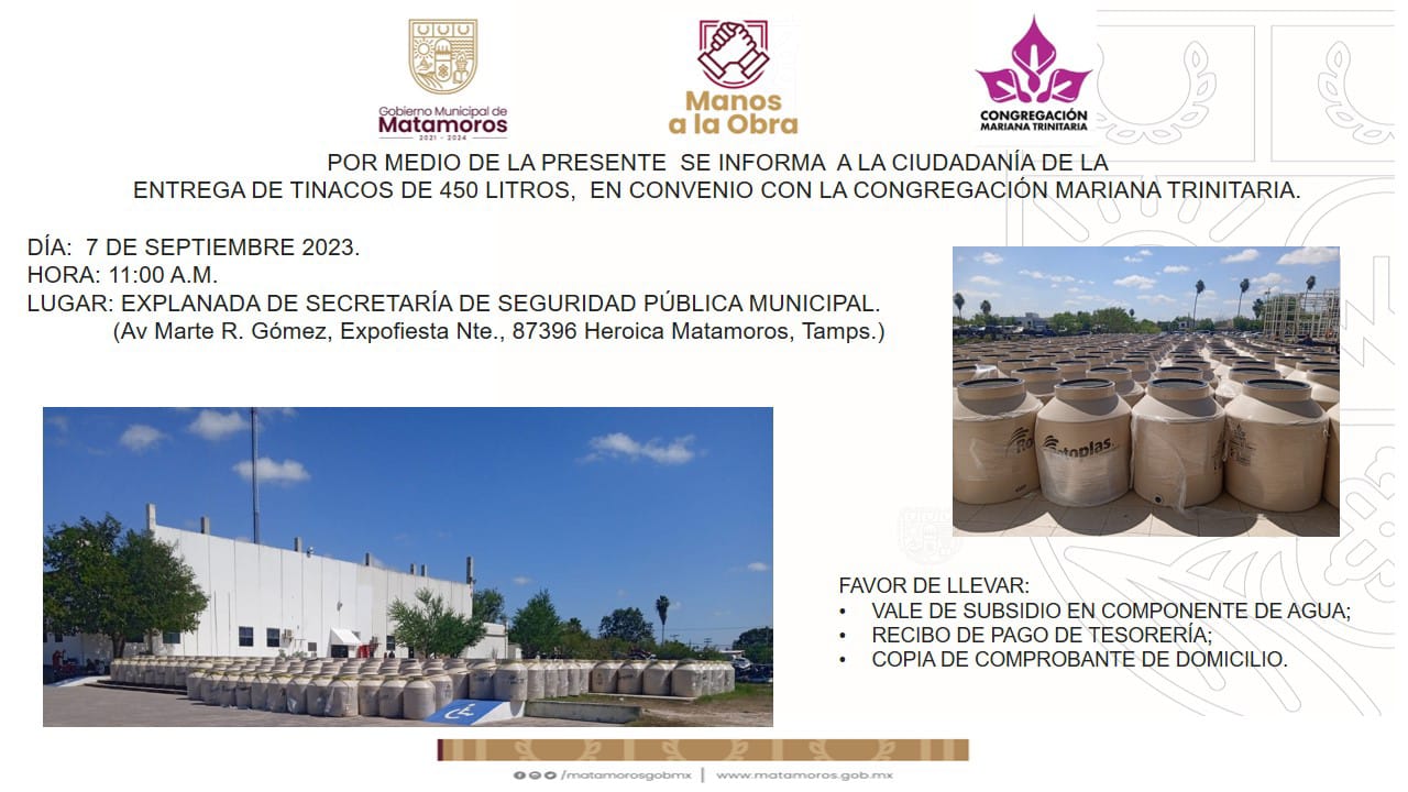 A TODAS LAS PERSONAS QUE FUERON BENEFICIADAS CON EL SUBSIDIO PARA UN TINACO POR PARTE DEL GOBIERNO DE MATAMOROS Y LA CONGREGACIÓN «MARIA TRINITARIA» SE LES SOLICITA PRESENTARSE ESTE JUEVES 7 DE SEPTIEMBRE, PARA HACER ENTREGA DE SU TINACO.