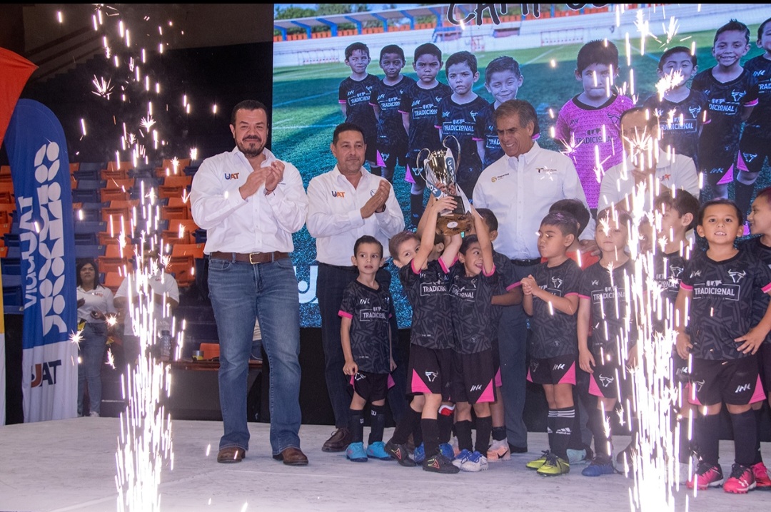 El rector de la Universidad Autónoma de Tamaulipas (UAT), Guillermo Mendoza Cavazos, presidió la ceremonia de premiación del torneo de fútbol infantil y juvenil “Copa UAT”, que en su edición número 39 logró una gran convocatoria de equipos participantes en Ciudad Victoria.