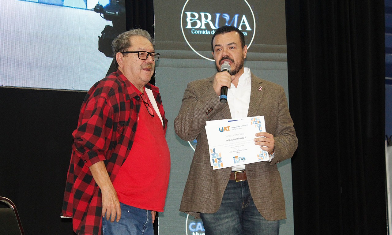 Presente en el evento, el escritor Bruno Arpaia compartió algunas reflexiones sobre su trabajo literario, y al concluir, el rector Guillermo Mendoza le hizo entrega de un reconocimiento por participar con la UAT en este importante espacio de difusión de la literatura y promoción de la lectura.