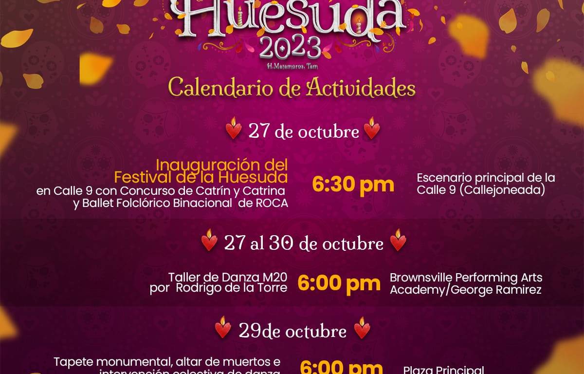 El Gobierno de Matamoros invita a las familias a participar en los diferentes eventos programados en el marco del Festival de la Huesuda 2023, que inician este 27 de Octubre en la Calle 9.